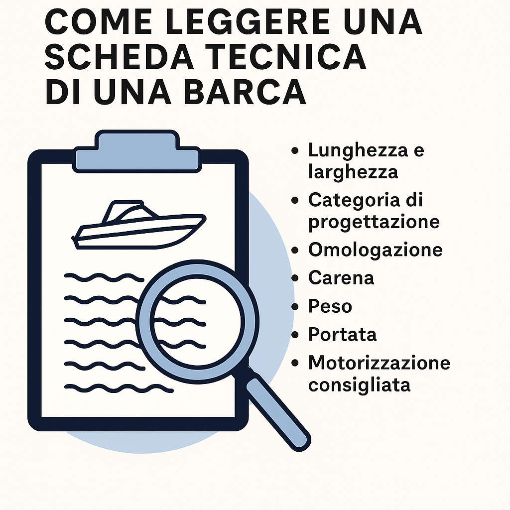 Non sai come leggere la scheda tecnica di una barca? Ecco la guida completa che spiega lunghezza, larghezza, categoria di progettazione, omologazione, carena, peso, portata e motorizzazione consigliata.